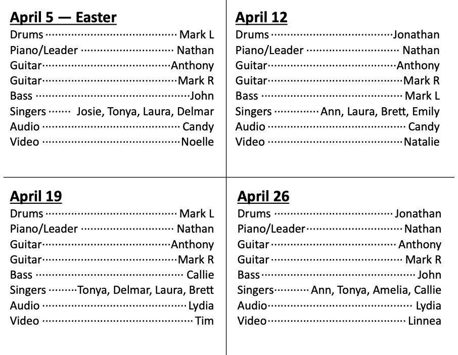 The worship team invites everyone to praise the Lord and give Him thanks for all He is and all He has done. While the worship style at WCBC would be considered contemporary, you will find that the worship on Sunday is not a performance, but rather an invitation to join in and lift our hearts and voices to praise our great God.